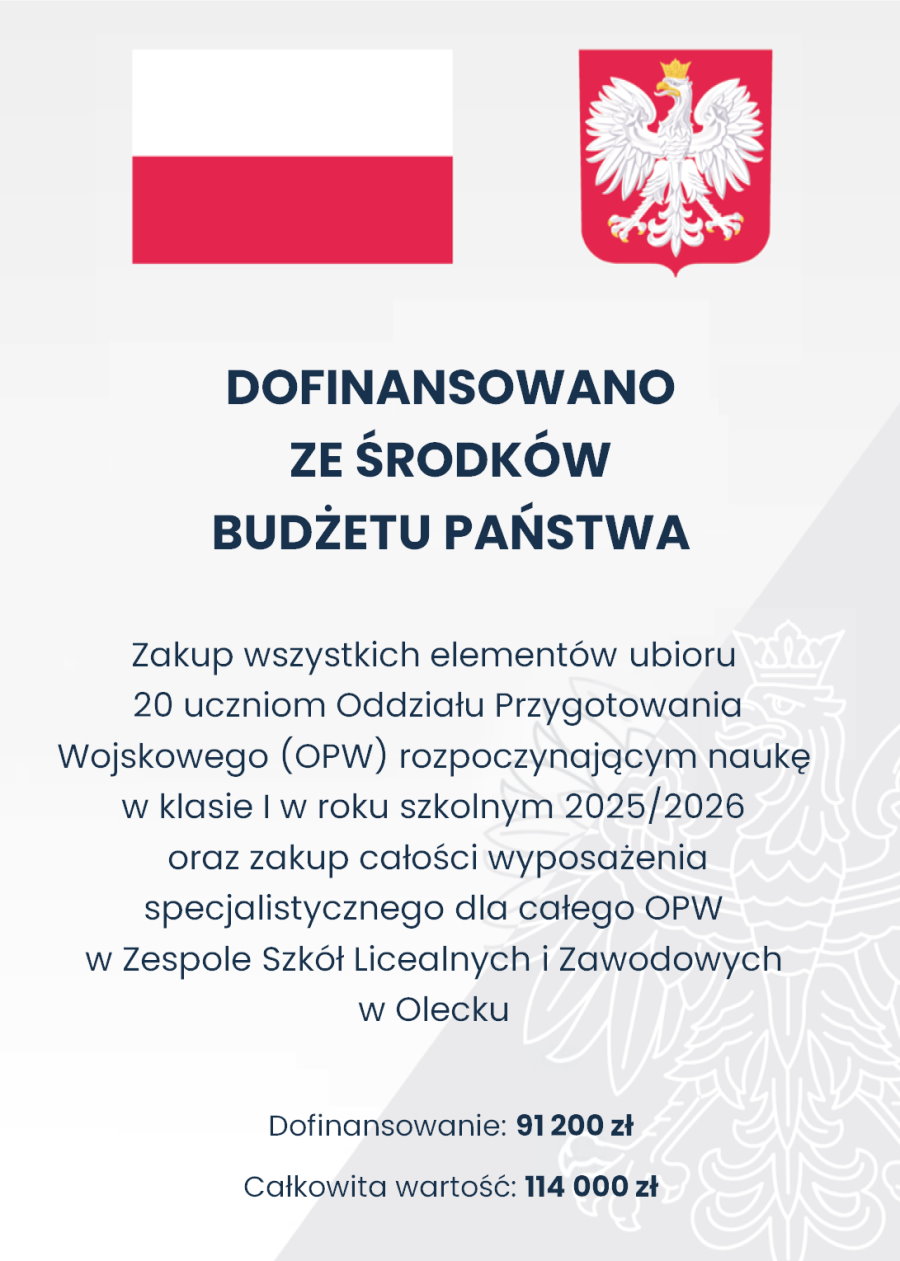 Pozyskaliśmy 91 200 zł z Ministerstwa Obrony Narodowej na zakup wszystkich elementów ubioru 20 uczniom Oddziału Przygotowania Wojskowego (OPW) rozpoczynającym naukę w klasie I w roku szkolnym 2025/2026 oraz zakup całości wyposażenia specjalistycznego dla całego OPW w Zespole Szkół Licealnych i Zawodowych w Olecku.