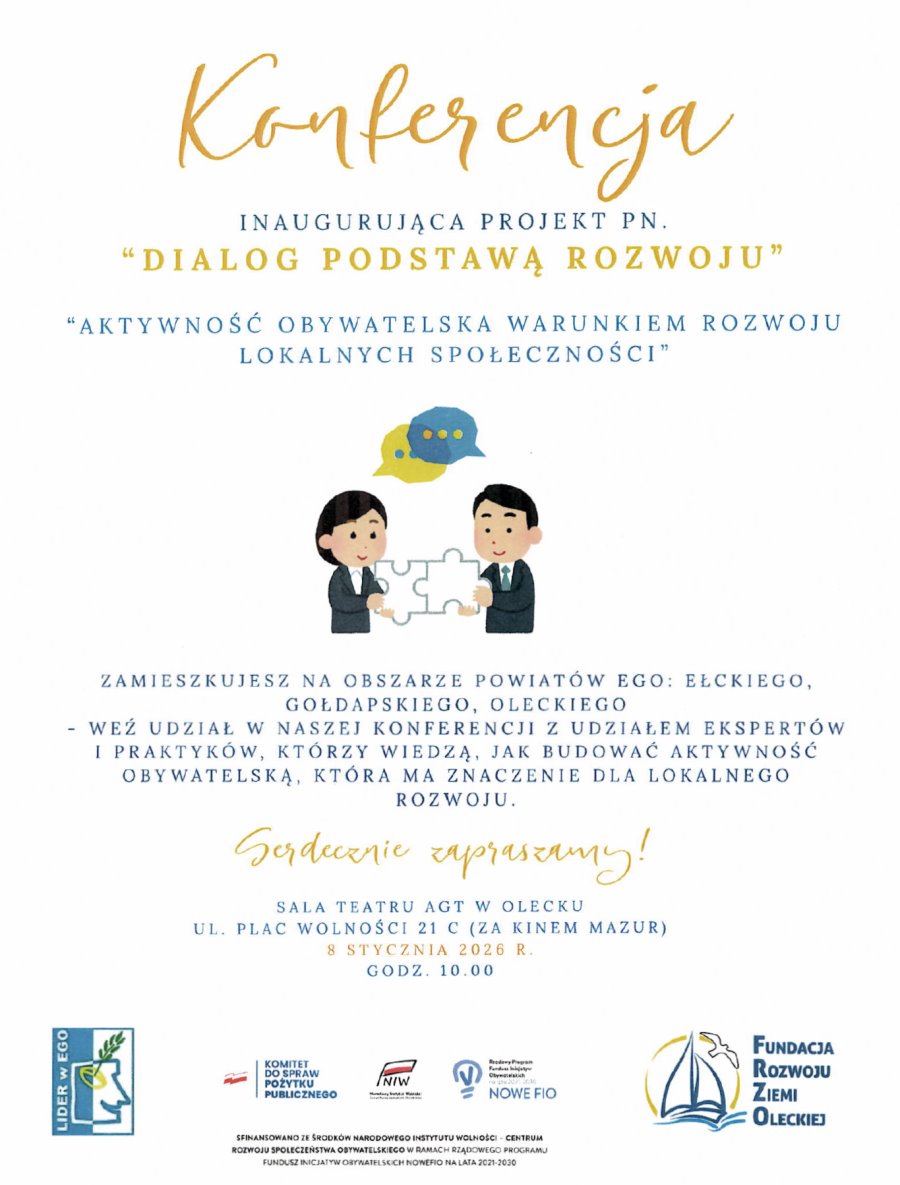 Serdecznie zapraszamy do wzięcia udziału w konferencji „Dialog podstawą rozwoju”, która organizowana jest przez Fundacje Rozwoju Ziemi Oleckiej w partnerstwie ze Stowarzyszeniem Lokalna Grupa Działania Lider w EGO.