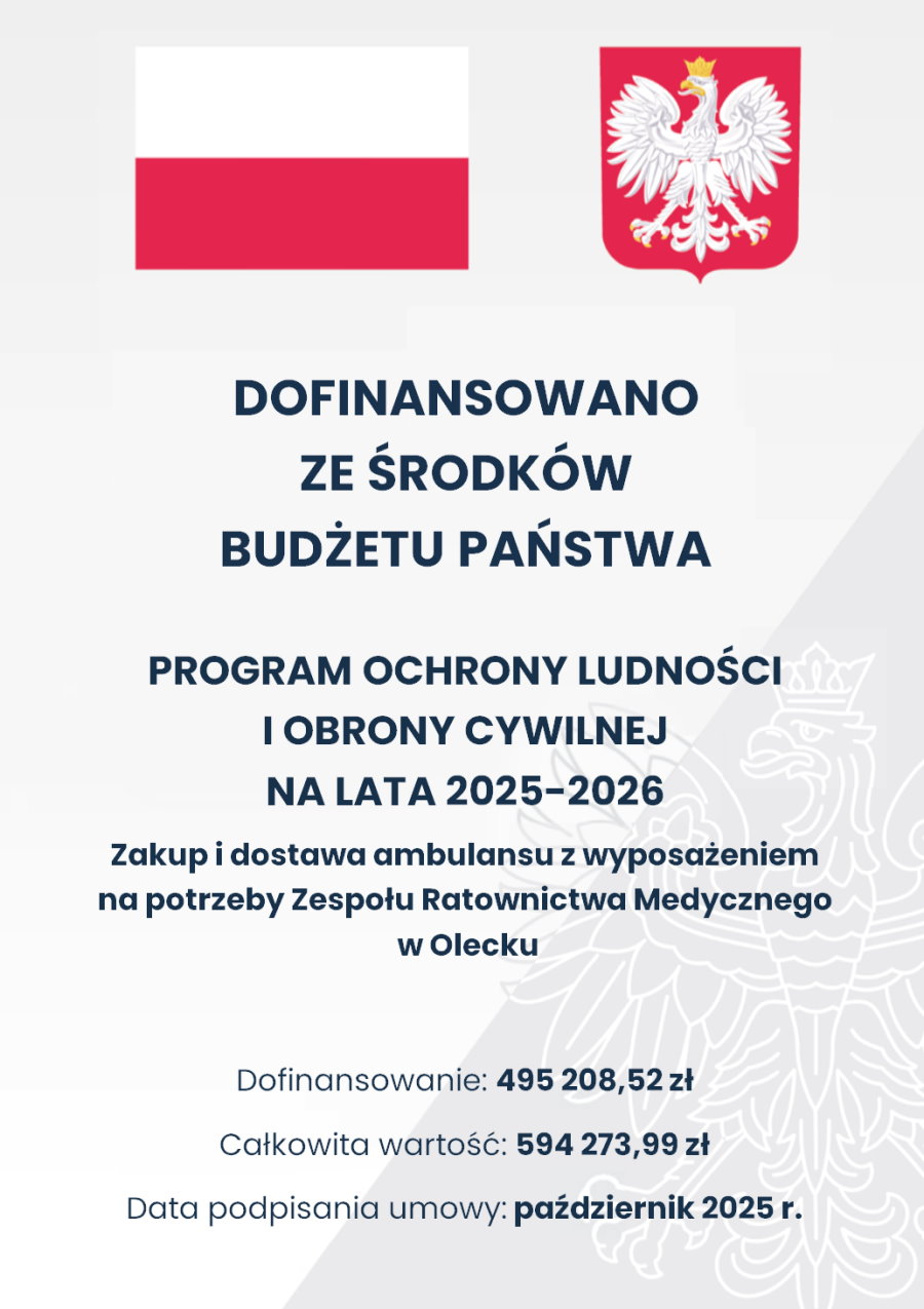Zakup sprzętu realizowany jest przez Powiat Olecki w ramach realizacji zadań wynikających z ustawy z dnia 5 grudnia 2024 r. o ochronie ludności i obronie cywilnej w oparciu Program Ochrony Ludności i Obrony Cywilnej, na podstawie umowy dotacji nr ZK-I.644.17.3.2025 o dofinansowanie w formie dotacji celowej zadań własnych realizowanych przez Jednostki Samorządu Terytorialnego.